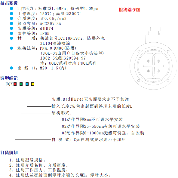 概 述 UQK浮球液位控制器属于位式控制仪器,适用开敞开或承压容器内液位的控制。当液位于高限或低限时,开关动作发出报警信号。 UQKC系列自测式浮球液位控制器可在设备运行条件下,扳动手柄,使浮球模拟控制器的状态,对系统进行检测。