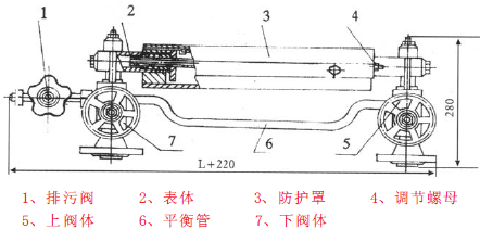 水位计由上阀(汽阀)、下阀(水阀)、表体、排污阀平衡管及防护罩等组成,其结构见图。在运行过程中,当石英管因意外事故受到破坏时,上、下阀门中的保险钢铢在容器内压力作用下,快速堵塞通道,直到手动关闭上、下阀门为止。